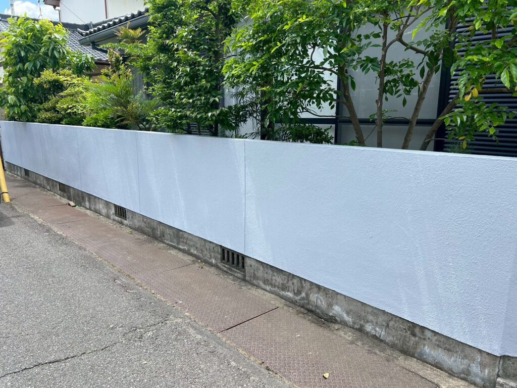 付帯部はシリコン塗料で細部まで丁寧に仕上げ、塀と基礎も専用塗料で清潔感のある印象へ。